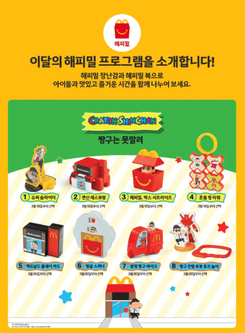 맥도날드 해피밀, 보배반점 식기 세트, 삼양 띠부씰, 럭킨커피 콜라보 굿즈.
